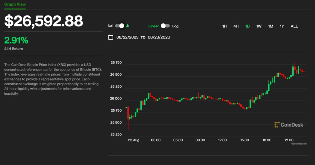 Bitcoin (BTC) climbed more than 3% to above $26,600 Wednesday afternoon, its highest price this week as crypto markets pared some of the losses booked in last Thursday’s tumble.