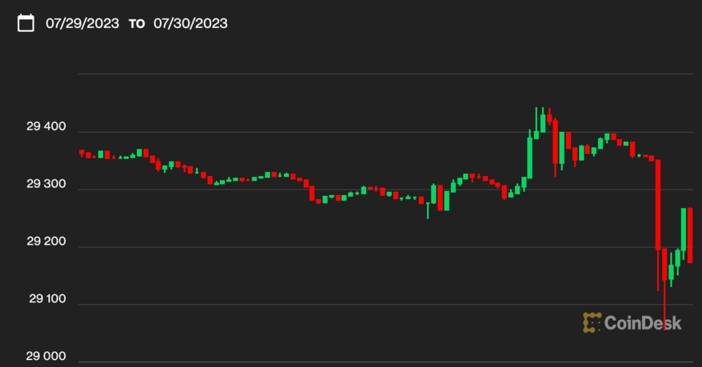 Bitcoin (BTC) was recently trading at $29,165, down 0.7%, over the past 24 hours. The largest cryptocurrency by market capitalization hovered above $29,300 for most of the weekend but dipped as low as about $23,100 in the hours after stablecoin exchange Curve Finance tweeted that it had suffered an exploit. The breach put more than $100 million in crypto at risk.
