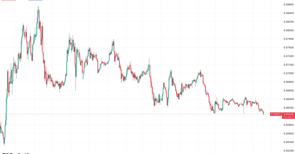 ETH-BTC dipped to near 0.0602 on Tuesday, according to TradingView data, its lowest reading since July.
