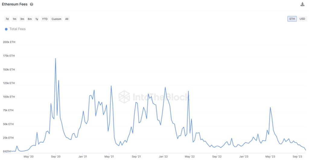 The Ethereum blockchain’s income from network fees dropped to its lowest level since April 2020 and is down 90% from its high this May, according to IntoTheBlock data.