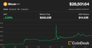Bitcoin is trading just above $28,500, up 5%, after a false report about the Securities and Exchange...