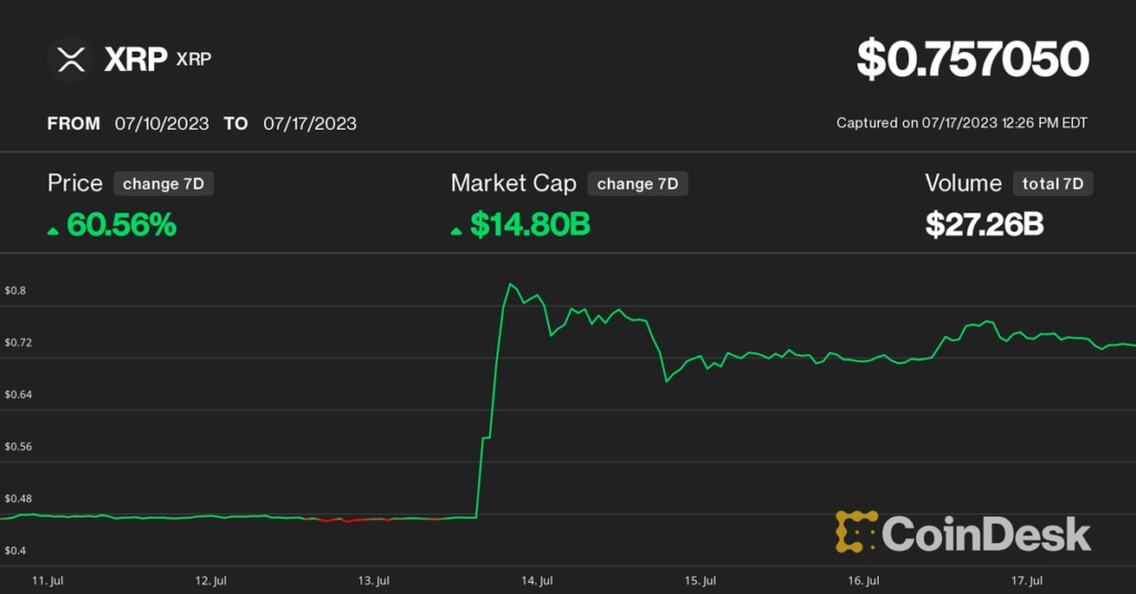 Though it’s given back some of last Thursday’s gains, XRP was still up roughly 60% since the ruling. The CoinDesk Crypto Market Index (CMI), which tracks the performance of the broader digital asset market, meanwhile, gave up all of its Thursday advance, declining 0.5% over the same period.